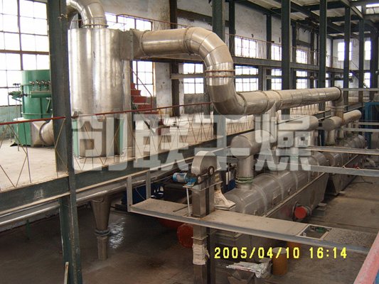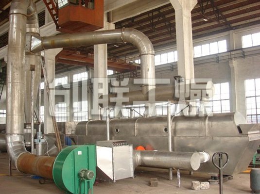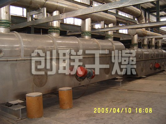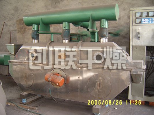 物料自進(jìn)料進(jìn)口進(jìn)入機內,在振動(dòng)力作用下,物料沿水平面流化床拋擲,向前連續運動(dòng),熱風(fēng)向上穿過(guò)流化床同濕物料換熱后,濕空氣經(jīng)旋風(fēng)分離器除塵后由排風(fēng)1:3排出.干燥物料由排料進(jìn)口排出。
