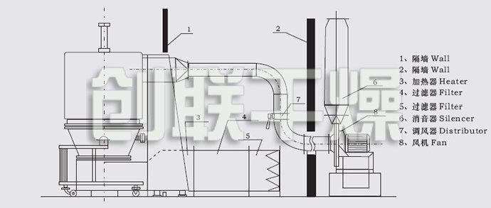 空氣經(jīng)加熱凈化后,由引風(fēng)機從下部導入,穿過(guò)料斗的孔網(wǎng)板。在工作室內,經(jīng)攪拌和負壓作用形成流態(tài)化,水份快速蒸發(fā)后隨著(zhù)排氣帶走,物料快速干燥。