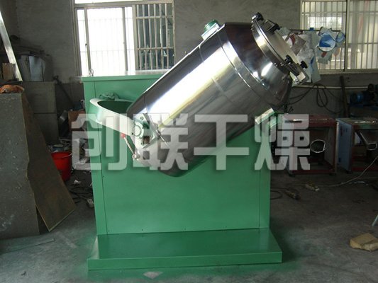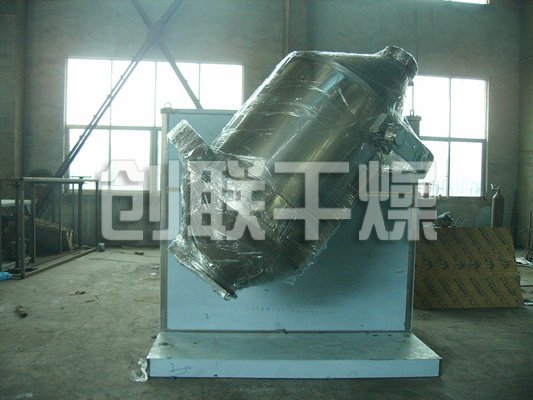 裝料的筒體在主動(dòng)軸的帶動(dòng)下,作周而復始的平移、轉動(dòng)和翻滾等復合運動(dòng),促使物料沿著(zhù)筒體作三向復臺運動(dòng),從而實(shí)現多種物料的互相流動(dòng)、擴散、積聚、摻雜.以達到均勻混合的目的。